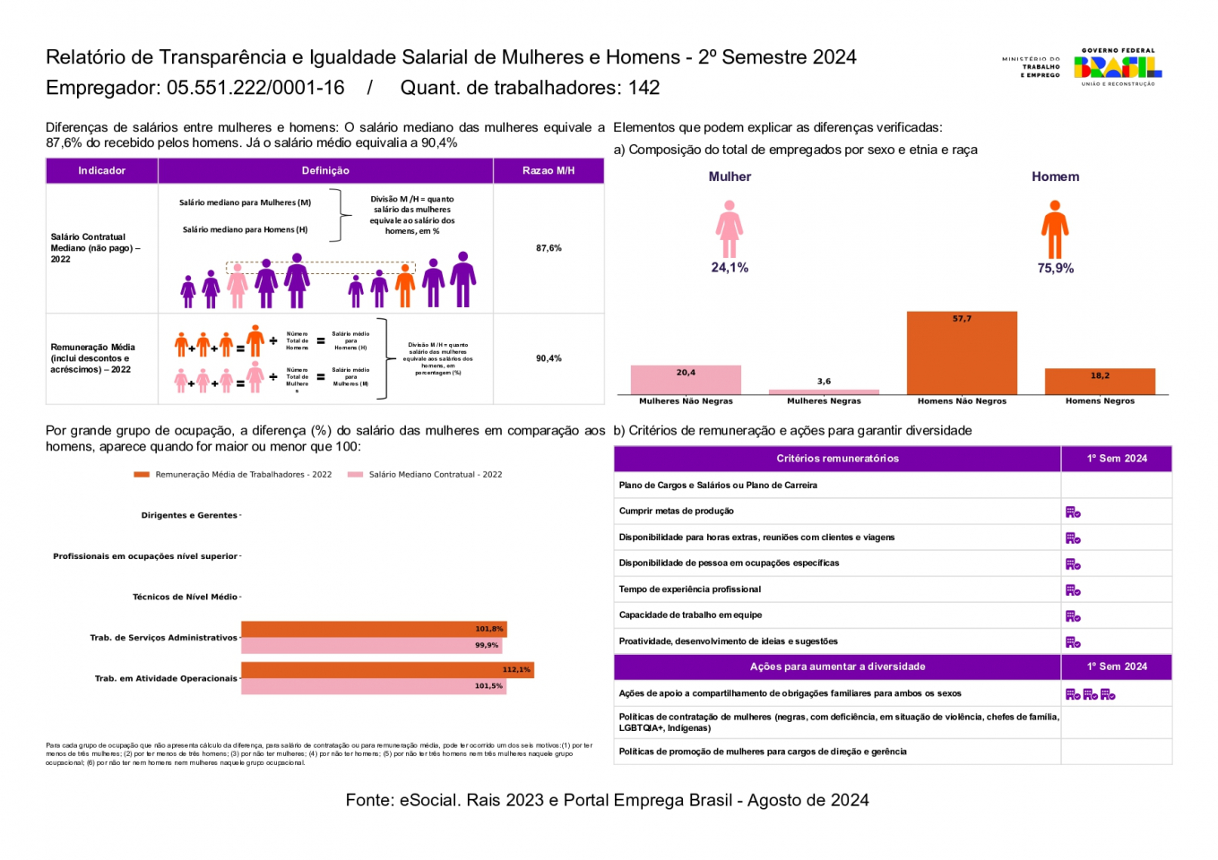 A Werk-Schott Pneumática, CNPJ 05.551.222/0001-16, com um quadro de 142 colaboradores, apresenta o Relatório de Transparência e Igualdade Salarial de Mulheres e Homens, referente ao 2º semestre de 2024, emitido ao Ministério do Trabalho.