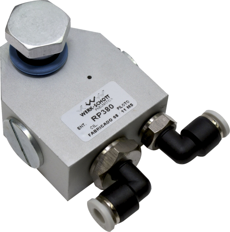 A Válvula de Retenção Pilotada, foi projetada com layout especial, para equipar os elevadores de acesso dos deficientes, nos Ônibus. Passou a ser utilizado também em diversas aplicações industriais, em máquinas, dispositivos, equipamentos e demais circuitos pneumáticos, que a necessitam. Disponíveis nas Bitolas de 1/4" e 3/8” BSP, são construídas em Corpo de Alumínio Anodizado e Vedações em Buna-N, sendo fixadas pelo parafuso vazado, na conexão de alimentação do cilindro. Sua função é permitir a passagem livre em um sentido de fluxo, bloqueando no sentido contrário, mas ao receber uma pressão na via de pilotagem, ocorre o desbloqueio, permitindo o fluxo livre em ambos os sentidos. Muito utilizadas em soluções para paradas de atuadores em situações de emergência ou bloqueios em posições selecionadas durante o seu deslocamento.