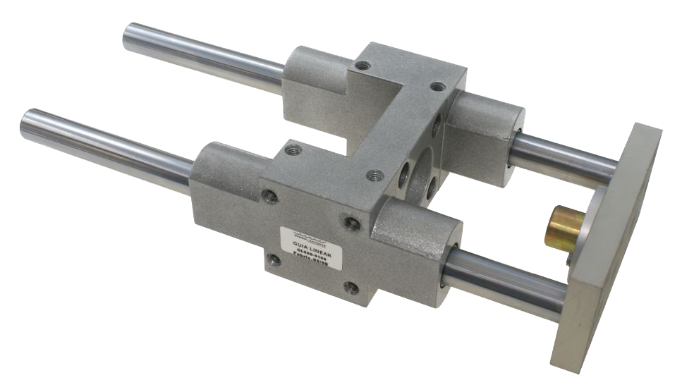 As Guias Lineares são dispositivos aplicados aos cilindros pneumáticos para evitar o giro da haste, oferecer maior precisão de movimento, impedir a flexão da haste e dar maior resistência estrutural aos esforços solicitados, nos equipamentos aplicados. Podem ser acopladas à Cilindros ISO 6431 de Ø 32 mm a Ø 100 mm e cursos de 10 a 500 mm; e também à Cilindros Mini ISO 6432 de Ø12 e 16 mm, com cursos de 2 à 200 mm e Ø 20 e 25 mm, com cursos de 2 à 250 mm. De construção robusta, com corpo e flange em alumínio e haste em aço cromado ou inox, são fornecidos com buchas ou rolamentos lineares de esferas e operam nas temperaturas de -10 ºC à +80 ºC.
