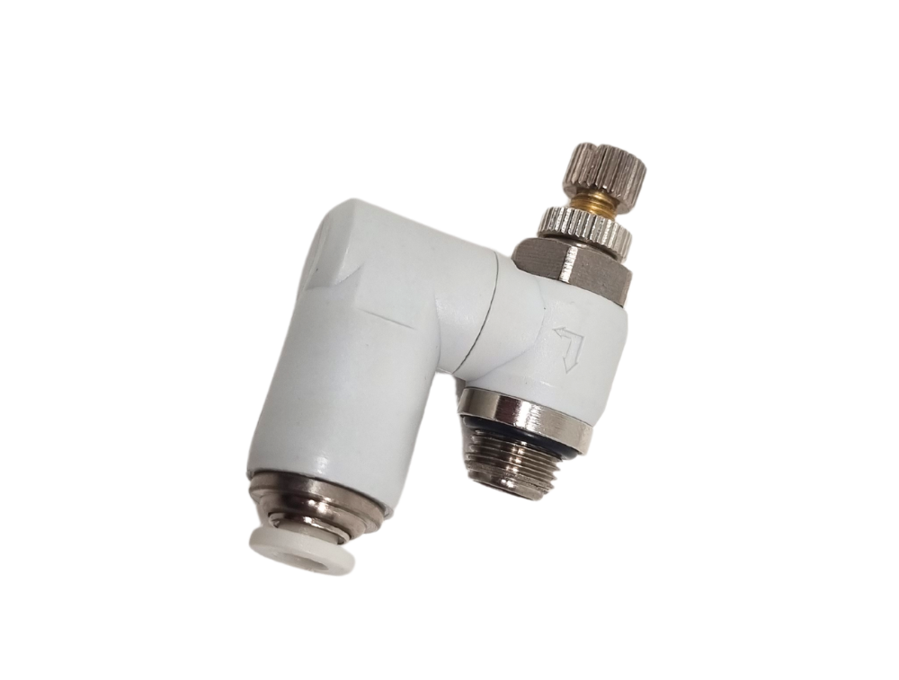 O regulador de fluxo com rotação de cotovelo é utilizado para regular a velocidade de trabalho, proporcionando um controle preciso e eficiente. Graças à construção em resina do corpo e à rotação do componente metálico, a direção da conexão é ajustável, oferecendo liberdade de movimento e flexibilidade nas operações.