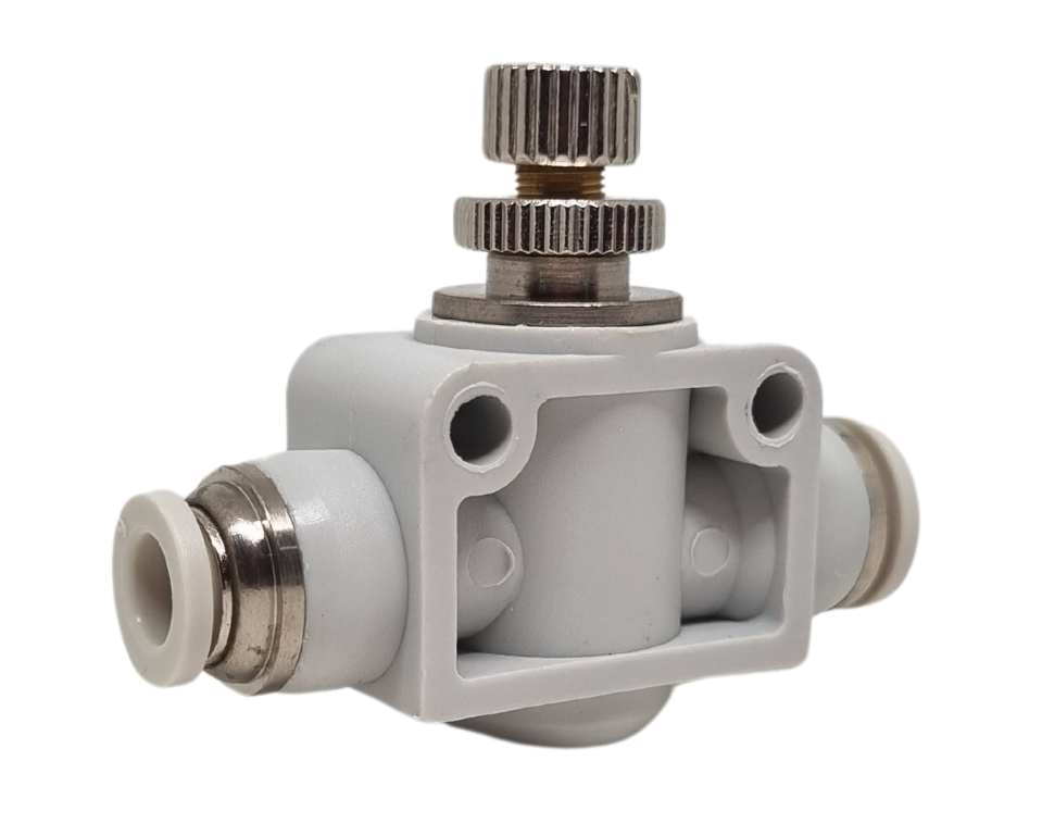 A conexão com regulagem de fluxo da linha polímero é a solução ideal para controlar com precisão o fluxo de ar, água ou vácuo em sistemas industriais. Fabricada com latão niquelado e plástico de engenharia, oferece alta resistência e durabilidade. Suporta pressões de até 15 bar e temperaturas de -20°C a 70°C, sendo compatível com tubos calibrados de poliuretano e nylon nos diâmetros de 4 a 12 mm. Essa conexão é amplamente utilizada em máquinas, equipamentos e dispositivos, garantindo ajuste fino do fluxo e desempenho confiável em aplicações industriais variadas.
