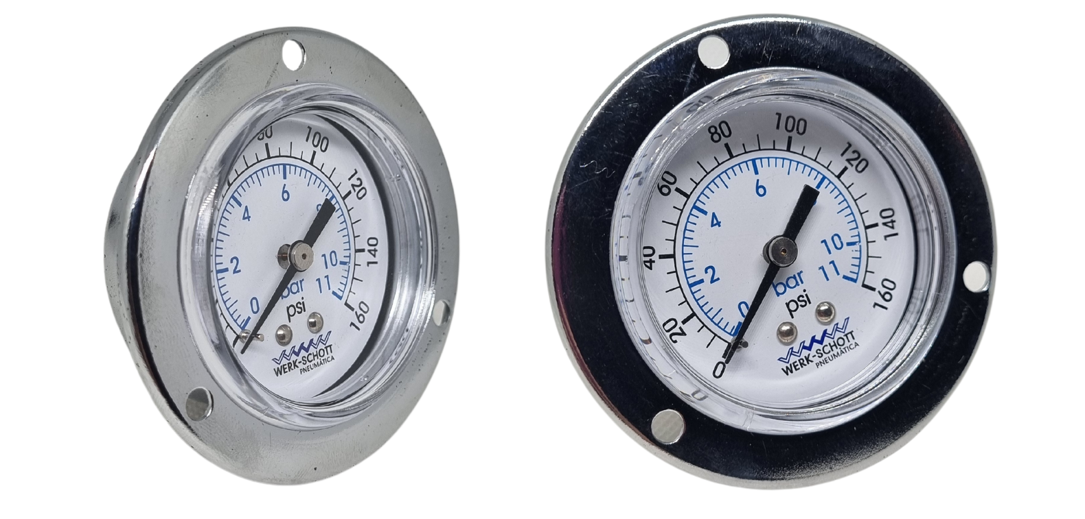 São instrumentos de medição de pressão, utilizados para regulagem, controle e leitura da pressão em sistemas pneumáticos. Do tipo construtivo – tubo de bourdon, apresentam o mostrador graduado em duas escalas de conversão direta - Bar / PSI. Possuem a saída reta horizontal traseira São ideias para painéis e carenagens de máquinas, resultando em excelente acabamento.