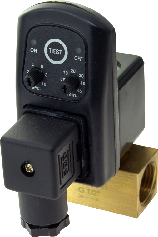 Composto por uma Válvula 2/2 vias, (3/8” ou 1/2” ), com acionamento elétrico e um Temporizador, promove a purga programada, de condensados das instalações pneumáticas.