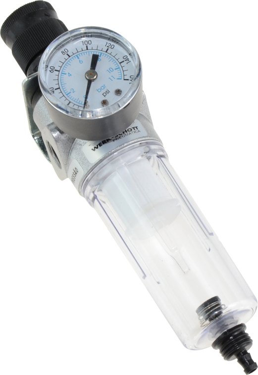 O filtro regulador, conjuga a filtro + regulador de pressão, num único e compacto corpo, que oferece economia de espaço na instalação e desempenho otimizado. Foi desenvolvido para filtrar o ar comprimido, retirar parte de gotas de umidade gerado pelo equipamento e ajustar a pressão. Ele permite que os equipamentos funcionem adequadamente com ar filtrado e pressão apropriada, o que evita o desgaste prematuro de todos os componentes. O filtro regulador da série 21 tem as seguintes características: bitola de 1/4” BSP, pressão máxima de entrada 10 Bar, pressão de trabalho – de 0,5 à 7 Bar, temperatura de trabalho -5⁰C à +60⁰C e vazão de 1230 L/min.