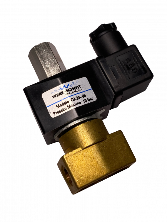 É uma Válvula Direcional de 3/2 vias - NF, Bitola de 1/4" BSP, de ação direta, acionada por solenoide IP65, Tensão de 220 Vca – 10W. Construída em corpo de latão e vedações em viton, opera com pressões de 0 à 10 bar e temperaturas de -10 ᵒC à +80 ᵒC. Compacta e robusta, de fácil instalação e manutenção, pode ser montada em qualquer posição. Apropriada para controlar abertura e fechamento de passagens de fluídos, como: ar comprimido, gás natural, água, óleo, vácuo, etc. Aplicadas em processos industriais, instrumentação, circuitos de refrigeração, circuitos de vácuo, máquinas e equipamentos em geral.
