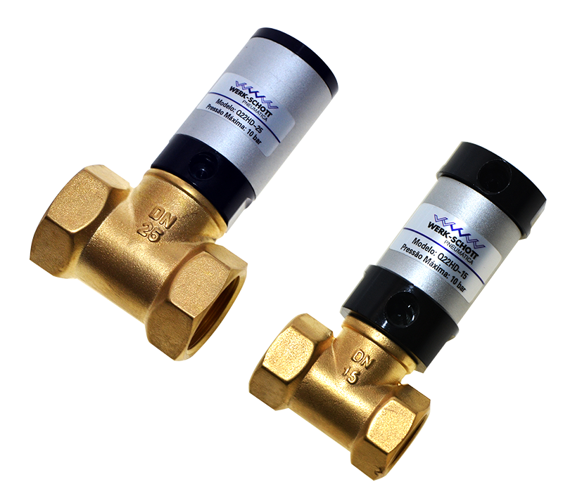 São válvulas direcionais de 2/2 Vias - NF, atuadas por um cilindro pneumático de simples ação com retorno por mola. Disponíveis nas Bitolas de 1/2", 3/4", 1”, 1 ¼”, 1 ½” e 2” BSP, com passagem plena, permitindo maior eficiência na vazão e desempenho na aplicação. Construídas em corpo de latão e vedações em PTFE (Teflon ), operam com pressão de até 10 Bar, temperaturas de -5 ⁰C à +150 ⁰C e podem ser instaladas em qualquer posição. São válvulas simples, robustas, versáteis e de reduzida manutenção. Podem ser utilizadas em ar comprimido, gases inertes e líquidos, com viscosidade média, não agressivos aos componentes. Utilizadas para abrir e fechar passagens de fluidos em processos industriais, instrumentação, reservatórios de ar comprimido, água, óleos, colas, vernizes, tintas, etc.